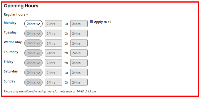 Please note: When inputting opening hours, use working-hour formats such as ‘14:45’ or ‘2:45 pm’.