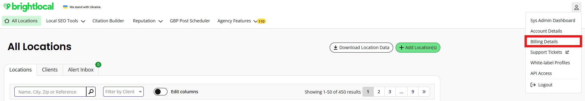 - Go to your billing settings: Log in to your BrightLocal account and click on your account menu at the top-right of any page. In the dropdown, select “Billing Details.”