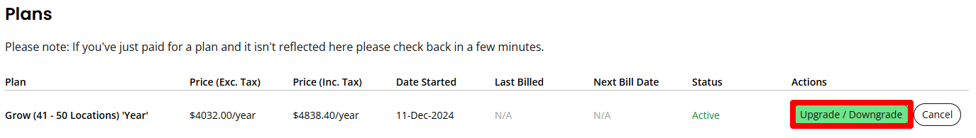 - Choose upgrade/downgrade: In your Billing Details page, you’ll see your current subscription plan information. Click the “Upgrade / Downgrade” button.