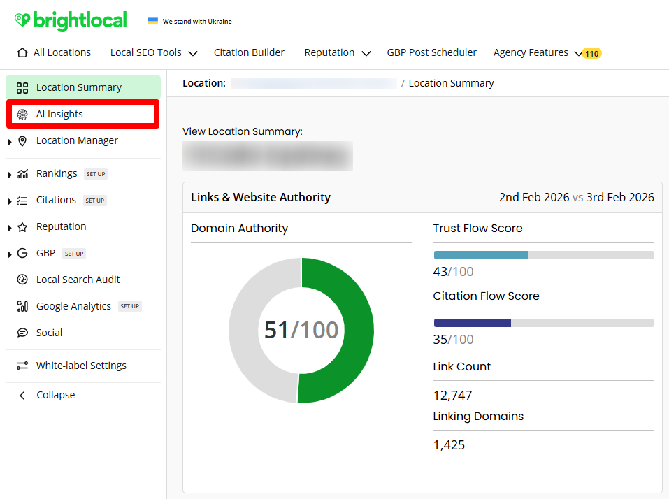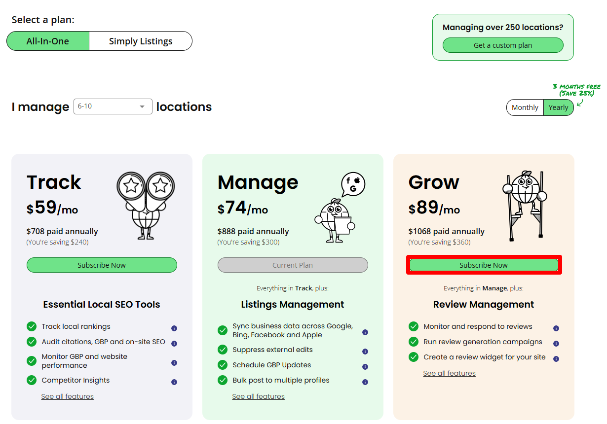 Select your new plan: You’ll be presented with BrightLocal’s plan options (Track, Manage, Grow) and a selector for the number of locations you manage, as well as monthly vs annual billing. To access AI Insights, choose the plan that includes what you need: